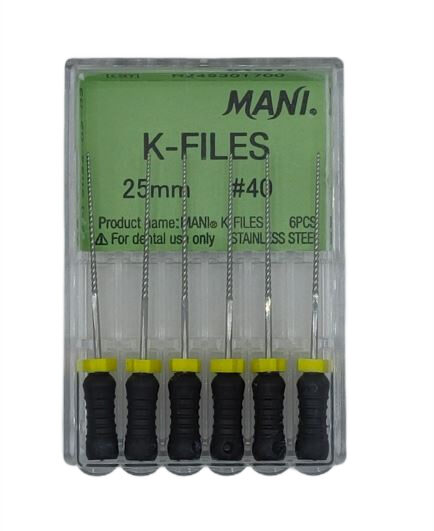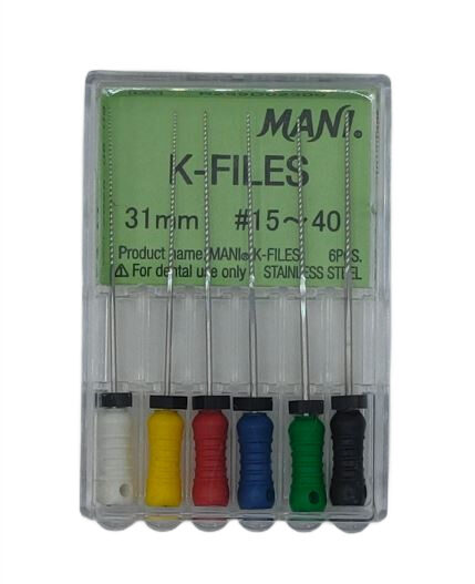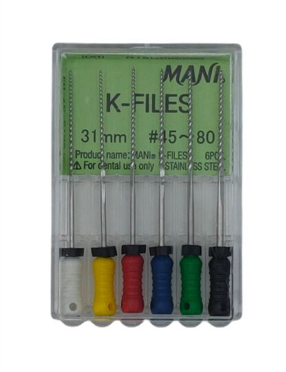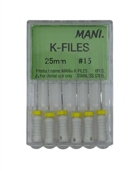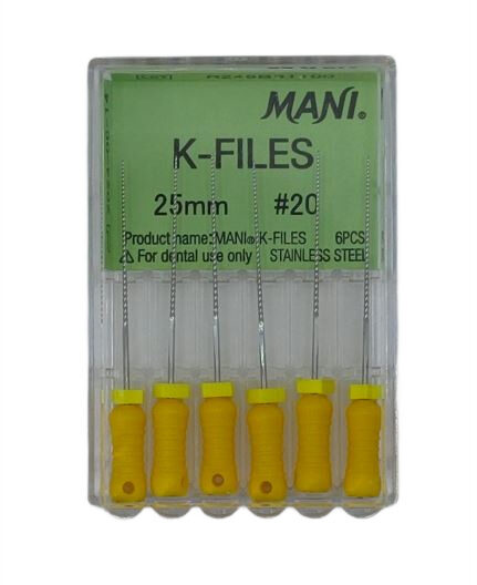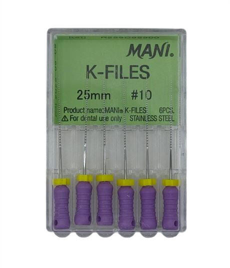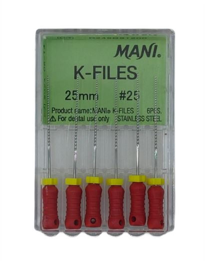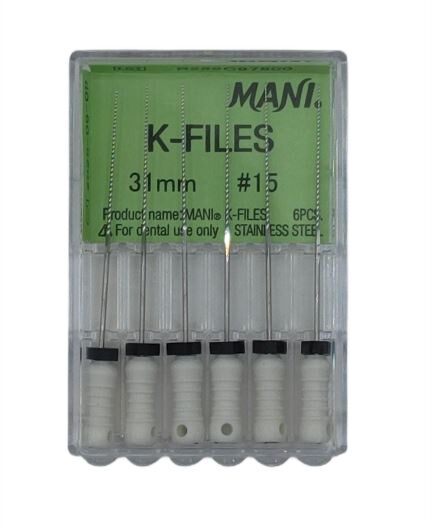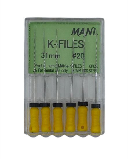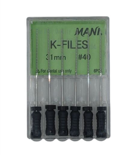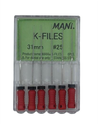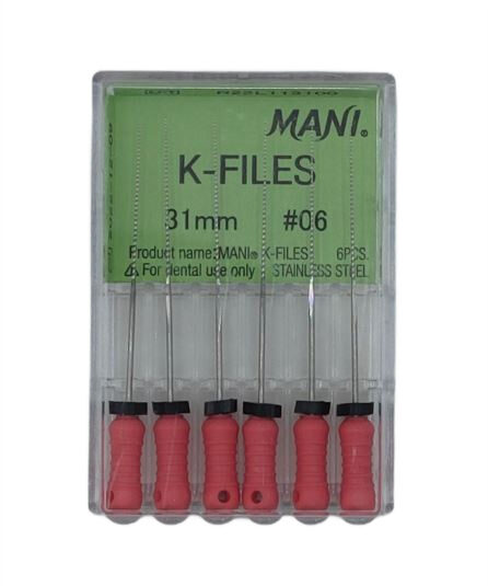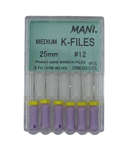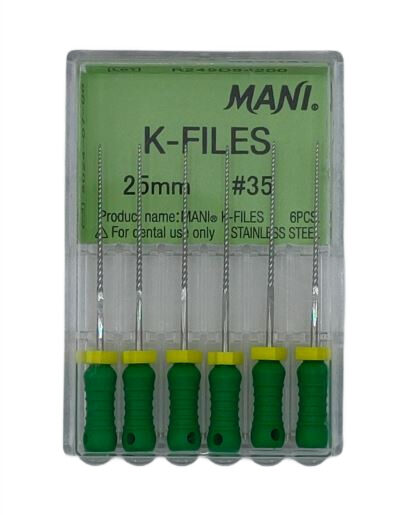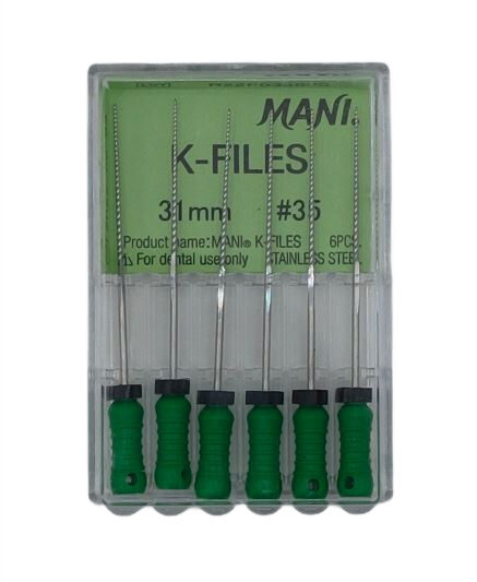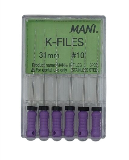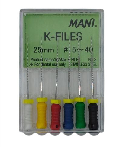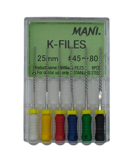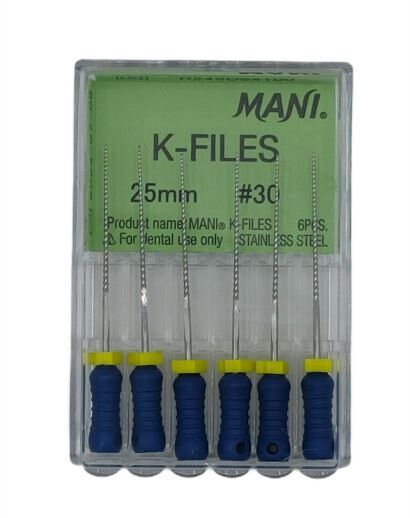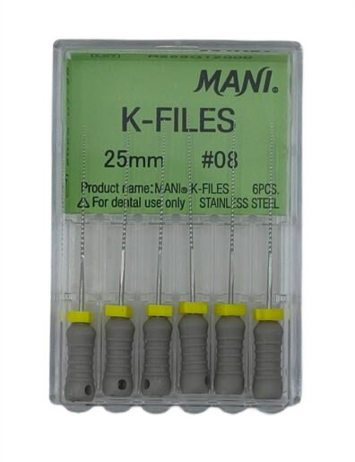 Pilniki K-Files MANI to wysokiej jakości narzędzia endodontyczne przeznaczone do ręcznego opracowywania i udrażniania kanałów korzeniowych. Wykonane z wytrzymałej stali nierdzewnej klasy medycznej, zapewniają doskonałą elastyczność, odporność na złamania oraz precyzyjną kontrolę pracy w kanale.