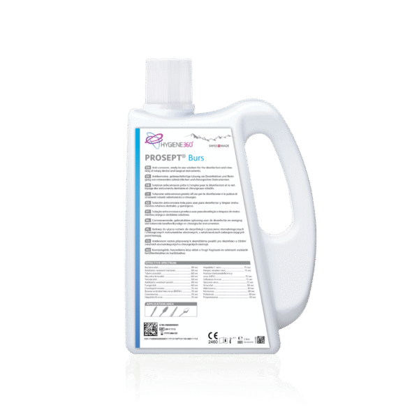 PROSEPT Burs to gotowy do użycia roztwór dezynfekcyjny przeznaczony do precyzyjnych obrotowych instrumentów dentystycznych i chirurgicznych, takich jak wiertła diamentowe, wiertła węglikowe, polerki oraz instrumenty wykonane ze stali. Preparat dezynfekujący oferuje szerokie spektrum działania w ciągu zaledwie jednej minuty. Zbilansowany skład oparty na alkoholach, środkach powierzchniowo czynnych oraz zasadach zapewnia wysoką aktywność nawet w przypadku podwyższonego poziomu zanieczyszczeń organicznych oraz pozwala osiągnąć wysoką moc czyszczącą. Brak zawartości aldehydów i fenoli zapobiega odbarwieniu i wiązaniu krwi. Inhibitory korozji znacząco wydłużają okres użytkowania instrumentu. Po dezynfekcji nie jest wymagane spłukiwanie, gdyż PROSEPT Burs odparowuje, nie pozostawiając żadnych szkodliwych pozostałości. Standardowa trwałość roztworu w warunkach średnich poziomów zanieczyszczeń wynosi jeden tydzień, dzięki czemu PROSEPT Burs można stosować w bardzo wydajny i ekologiczny sposób.