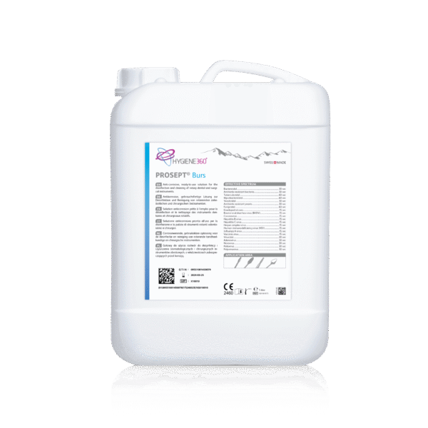 PROSEPT Burs to gotowy do użycia roztwór dezynfekcyjny przeznaczony do precyzyjnych obrotowych instrumentów dentystycznych i chirurgicznych, takich jak wiertła diamentowe, wiertła węglikowe, polerki oraz instrumenty wykonane ze stali. Preparat dezynfekujący oferuje szerokie spektrum działania w ciągu zaledwie jednej minuty. Zbilansowany skład oparty na alkoholach, środkach powierzchniowo czynnych oraz zasadach zapewnia wysoką aktywność nawet w przypadku podwyższonego poziomu zanieczyszczeń organicznych oraz pozwala osiągnąć wysoką moc czyszczącą. Brak zawartości aldehydów i fenoli zapobiega odbarwieniu i wiązaniu krwi. Inhibitory korozji znacząco wydłużają okres użytkowania instrumentu. Po dezynfekcji nie jest wymagane spłukiwanie, gdyż PROSEPT Burs odparowuje, nie pozostawiając żadnych szkodliwych pozostałości. Standardowa trwałość roztworu w warunkach średnich poziomów zanieczyszczeń wynosi jeden tydzień, dzięki czemu PROSEPT Burs można stosować w bardzo wydajny i ekologiczny sposób.
