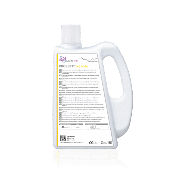 PROSEPT Jet Forte to płynny koncentrat przeznaczony do pielęgnacji i czyszczenia urządzeń ssących, misek spluwaczek oraz separatorów amalgamatu. Preparat skutecznie usuwa pozostałości krwi, białka i innych osadów dzięki alkalicznym środkom aktywnym. Systematyczny rozkład biofilmu we wnętrzu urządzenia ssącego zapobiega powstawaniu nieprzyjemnych zapachów. PROSEPT Jet Forte nie zawiera substancji agresywnych, takich jak aldehydy lub fenole, zapewniając wysoką kompatybilność materiałową, jak również istotnie wydłużając trwałość węży i urządzeń ssących. Dodatkowo środki przeciwspieniające chronią części mechaniczne, gwarantując sprawne działanie urządzenia ssącego.