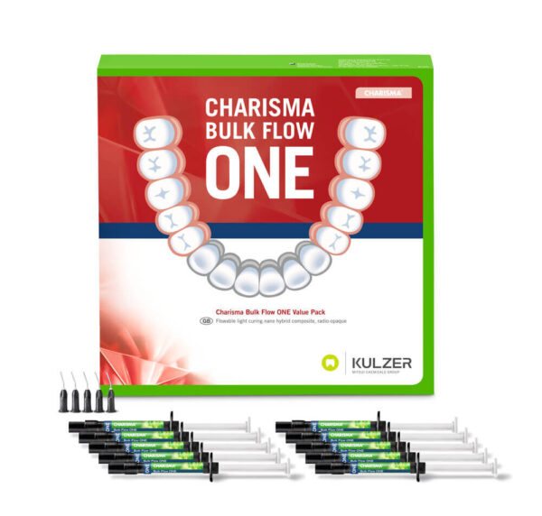 Charisma Bulk Flow ONE to pierwszy płynny kompozyt typu bulk-fill dostosowujący się do koloru tkanki zęba, który nie wymaga nakładania dodatkowej warstwy wierzchniej. Jest to idealny wybór do wykonywania uzupełnień zębów bocznych w codziennej pracy. Płynna konsystencja oraz możliwość nakładania warstwy o grubości do 4mm sprawi, że będzie to najczęściej wybierany kompozyt typu bulk-fill. Ponadto Charisma Bulk Flow ONE posiada niespotykane właściwości dopasowania koloru (od A1 do D4)