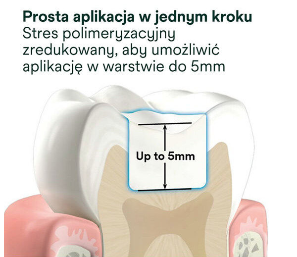 - Szybka i łatwa jednoetapowa aplikacja kompozytu typu bulk fill do 5 mm – stosowanie warstwy zakrywającej nie jest konieczne